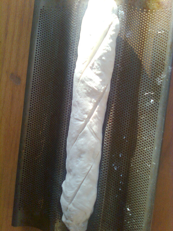 Nowadays, if someone would ask me to name 3 things that are always in my refrigerator I’d say: white wine (from the Alsace, of course), zucchini pickles, and bread dough. I love this recipe. I can make the perfect baguette in the same time it takes me to go to the store and buy one. I finally found a recipe that is so laughingly easy that we can have great bread every weekend or even every day for that matter. (In a pinch, it can also make pretty good pizza dough and bagels too. But those are other stories) To bake off your baguette; simply sprinkle the surface of the cold dough with flour. Grab a fistful about the size of a grapefruit. (*-see bottom footnote) Take the blob of dough and plunk it down on a lightly floured surface, floured side down. Push it into a rectangle form. Roll into a log a bit shorter than the baguette form pan. Roll the log to smoothen and lengthen it. Pick up the dough at the ends and put it in the form.